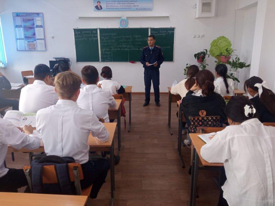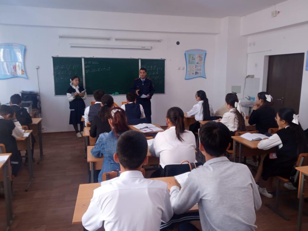 Тараз қаласы полиция басқармасы 2-ПБ ЖПҚБ ЮПТ аға УПИ полиция майоры Адилхан М.А 9-11 сынып оқушылары арасында "ҚР ҚК-нің 188 бабы, ұрлық" ҚР ӘҚБтК-нің 440, 442,127 баптары мен таныстырылып, түсіндіру жұмыстары жүргізілді.