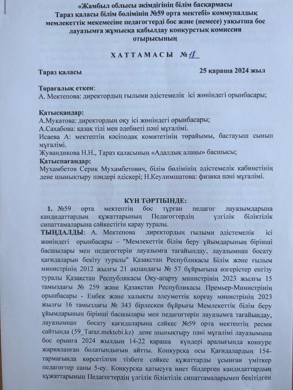 25 қараша 2024 0 1 2 3 4 5 №59 орта мектебенің уақытша бос тұрған дене шынықтыру пәнінен лауазымды тағайындау туралы №18 хаттамасы