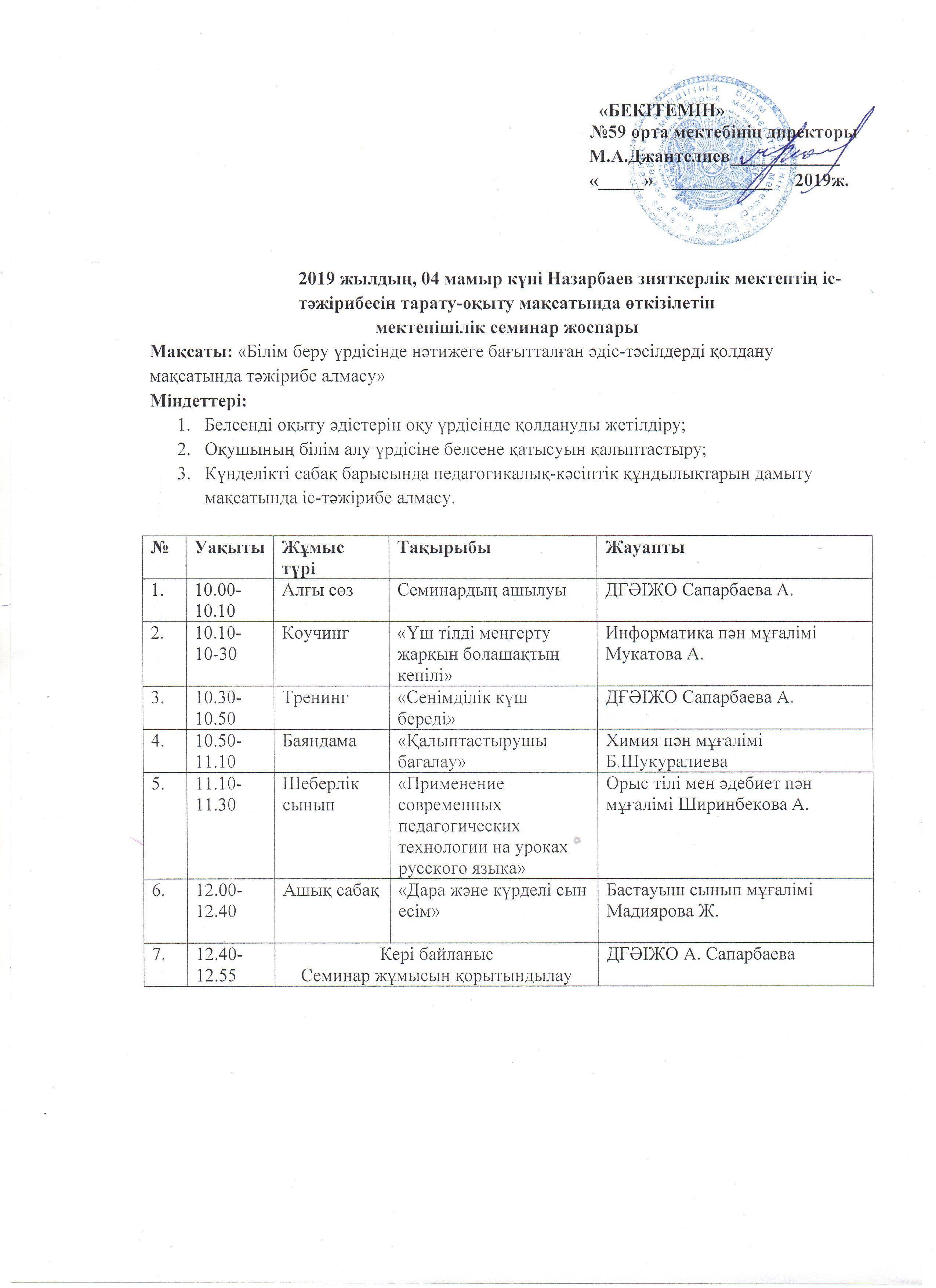№59 орта мектеп » Біз туралы » Әдістемелік жұмыстар » 2018-2019 оқу жылындағы 4 мамыр күні Назарбаев Зияткерлік мектептің іс-тәжірбиесін тарату-оқыту мақсатында өткізілетін мектепішілік семинар
