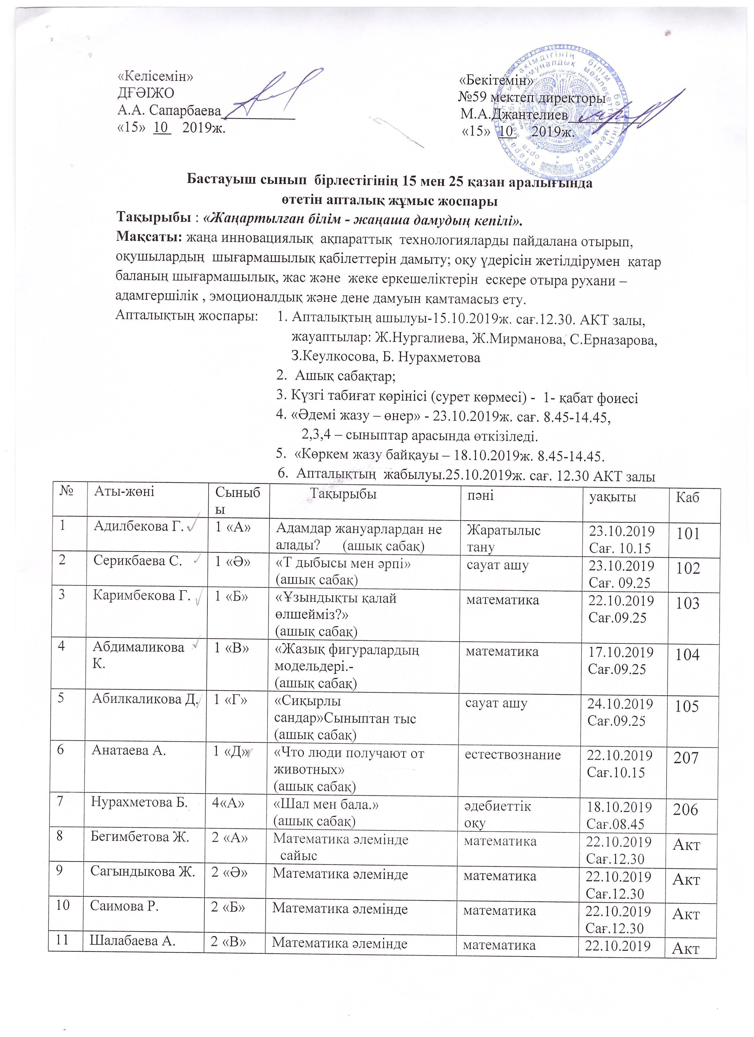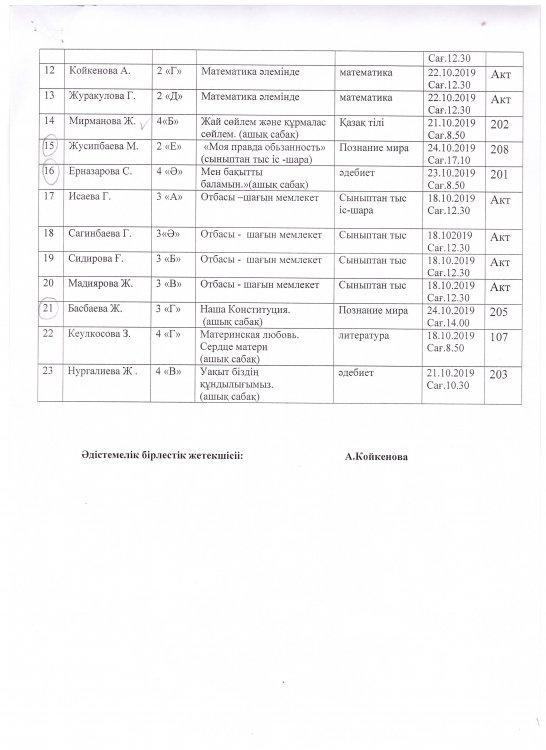 18 қараша 2019 0 1 2 3 4 5 Бастауыш сынып бірлестігінің 15 мен 25 қазан аралығында өткізілген жұмыс жоспары Бастауыш сынып бірлестігінің 15 мен 25 қазан аралығында өткізілген жұмыс жоспары