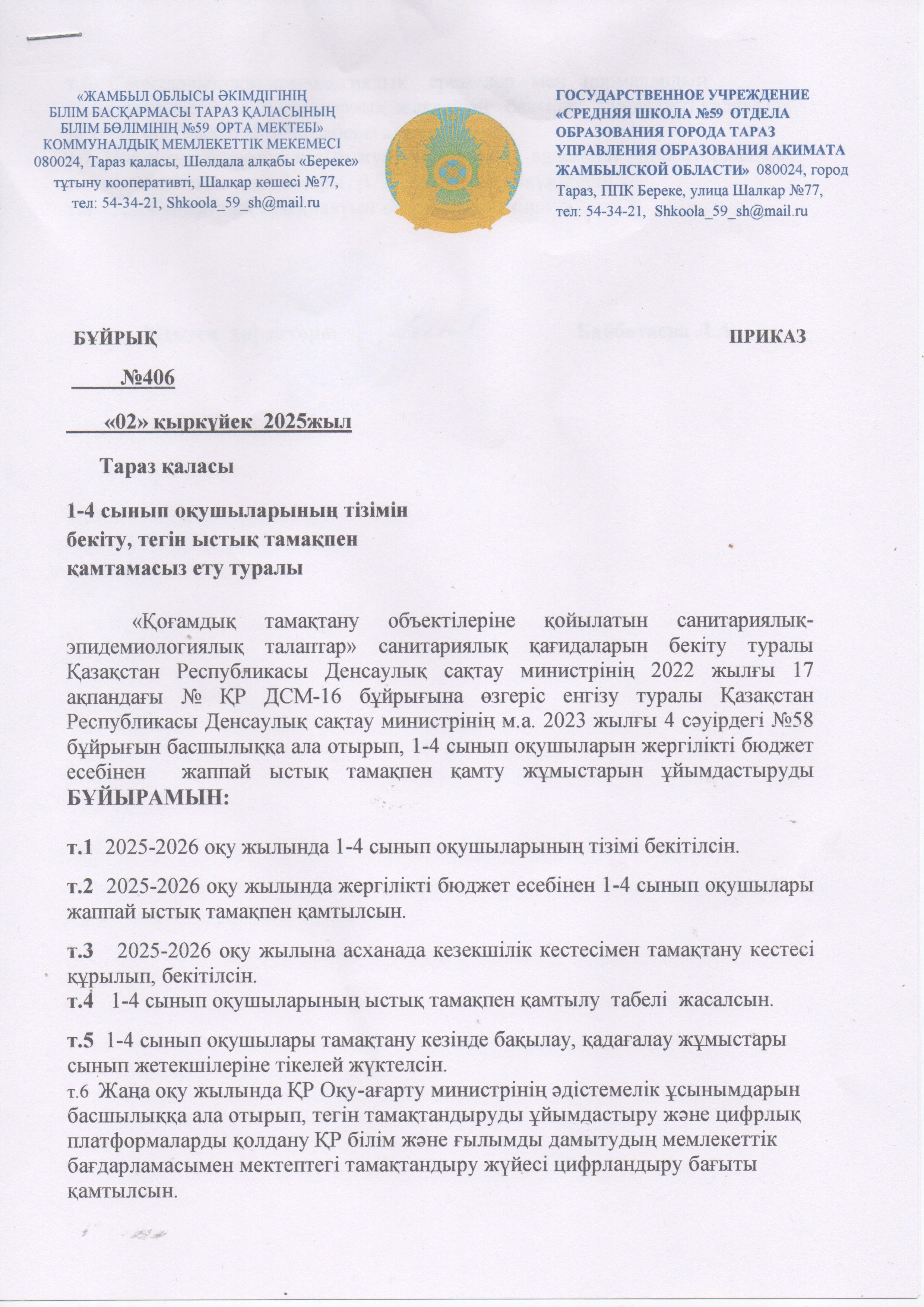 1-4 сынып білім алушыларын тегін тамақпен қамту » №59 орта мектеп