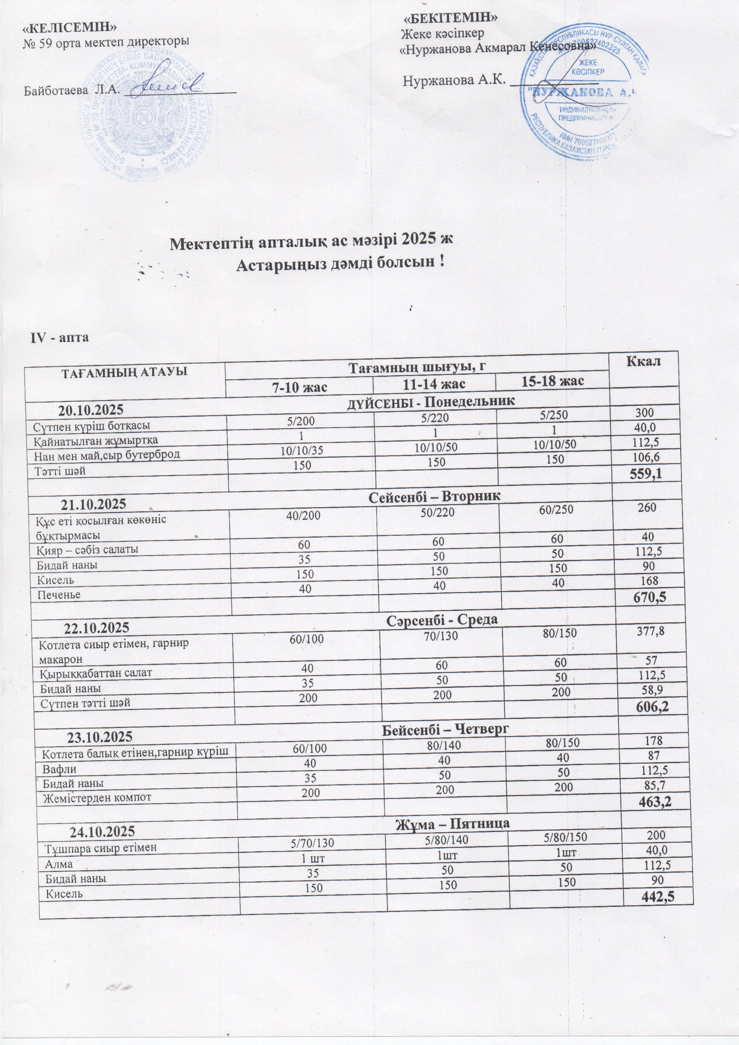 20.10-24.10.2025 Апталық ас мәзірі » №59 орта мектеп