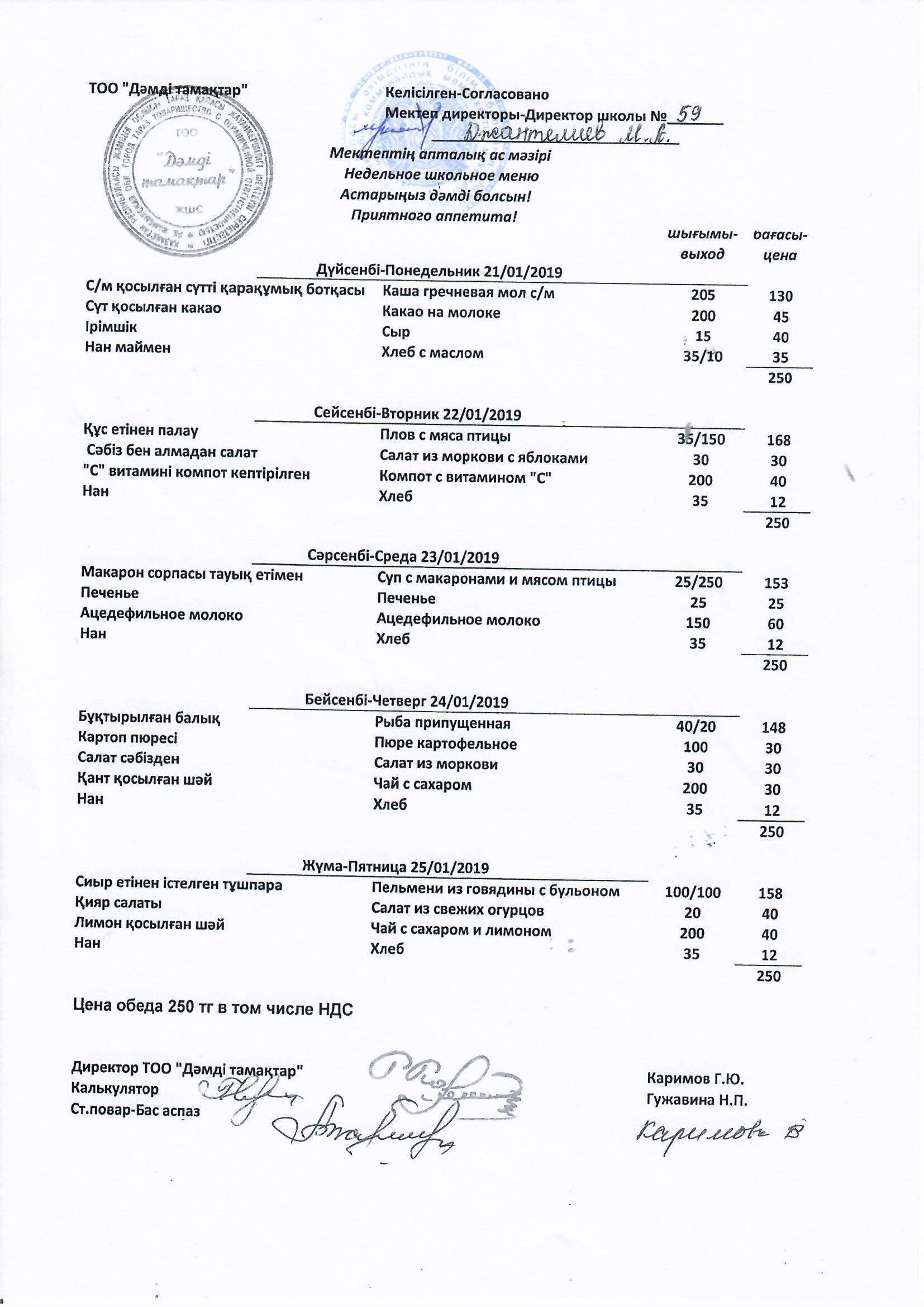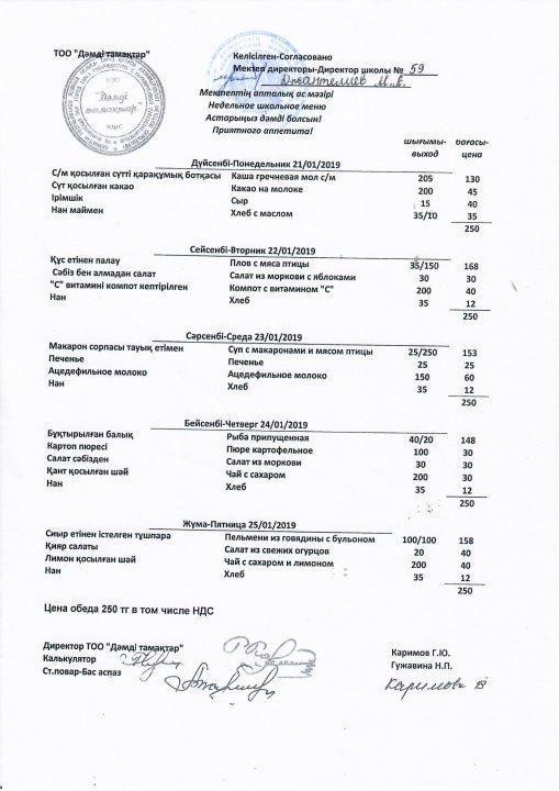 21 қаңтар 2019 0 1 2 3 4 5 №59 орта мектебінің ТОО "Дәмді тамақтар" ұсынған 21.01-25.01.2019 жылғы апталық мәзірі