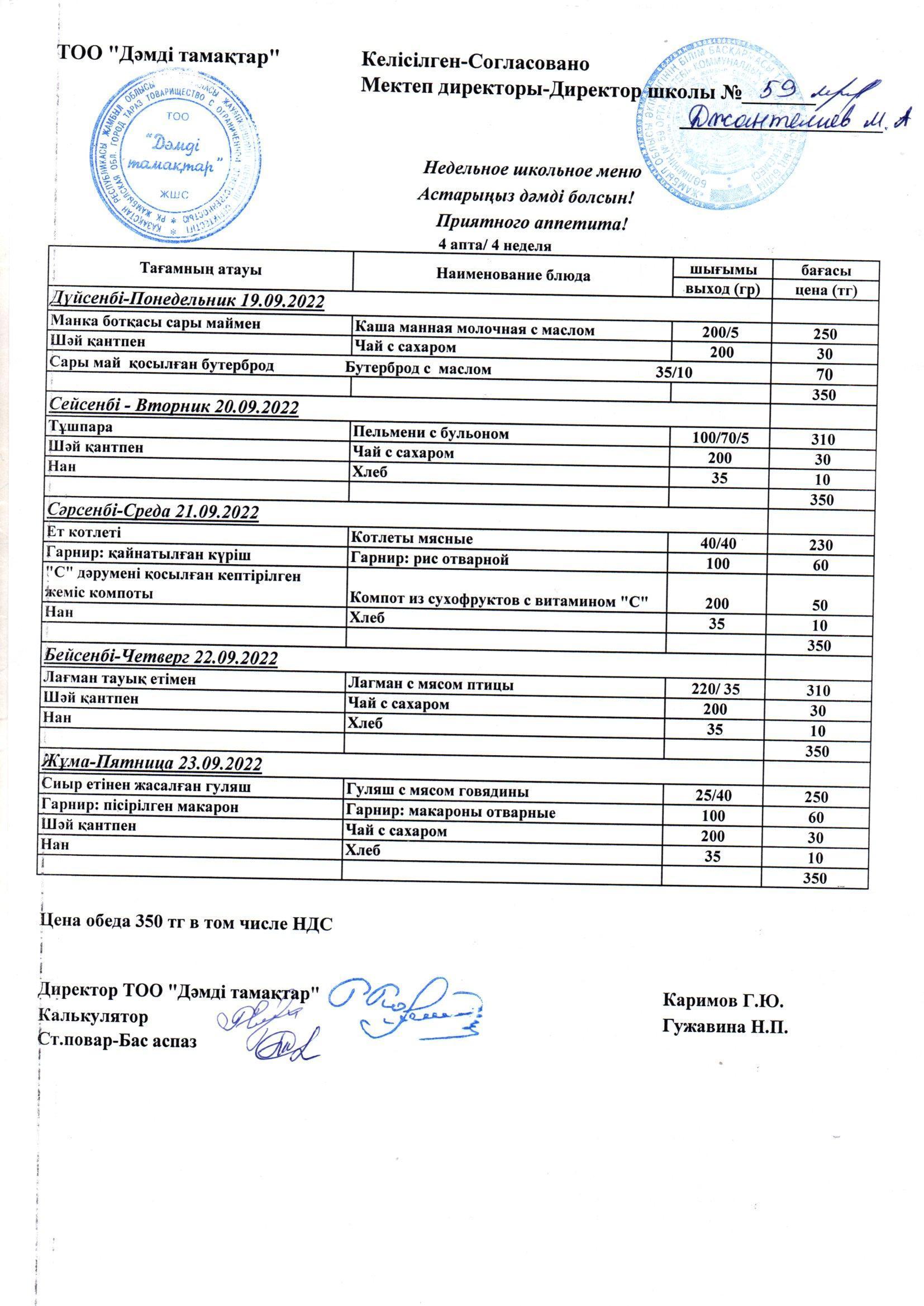 19-23 қыркүйек аралғыныдағы апталық ас мәзірі » №59 орта мектеп