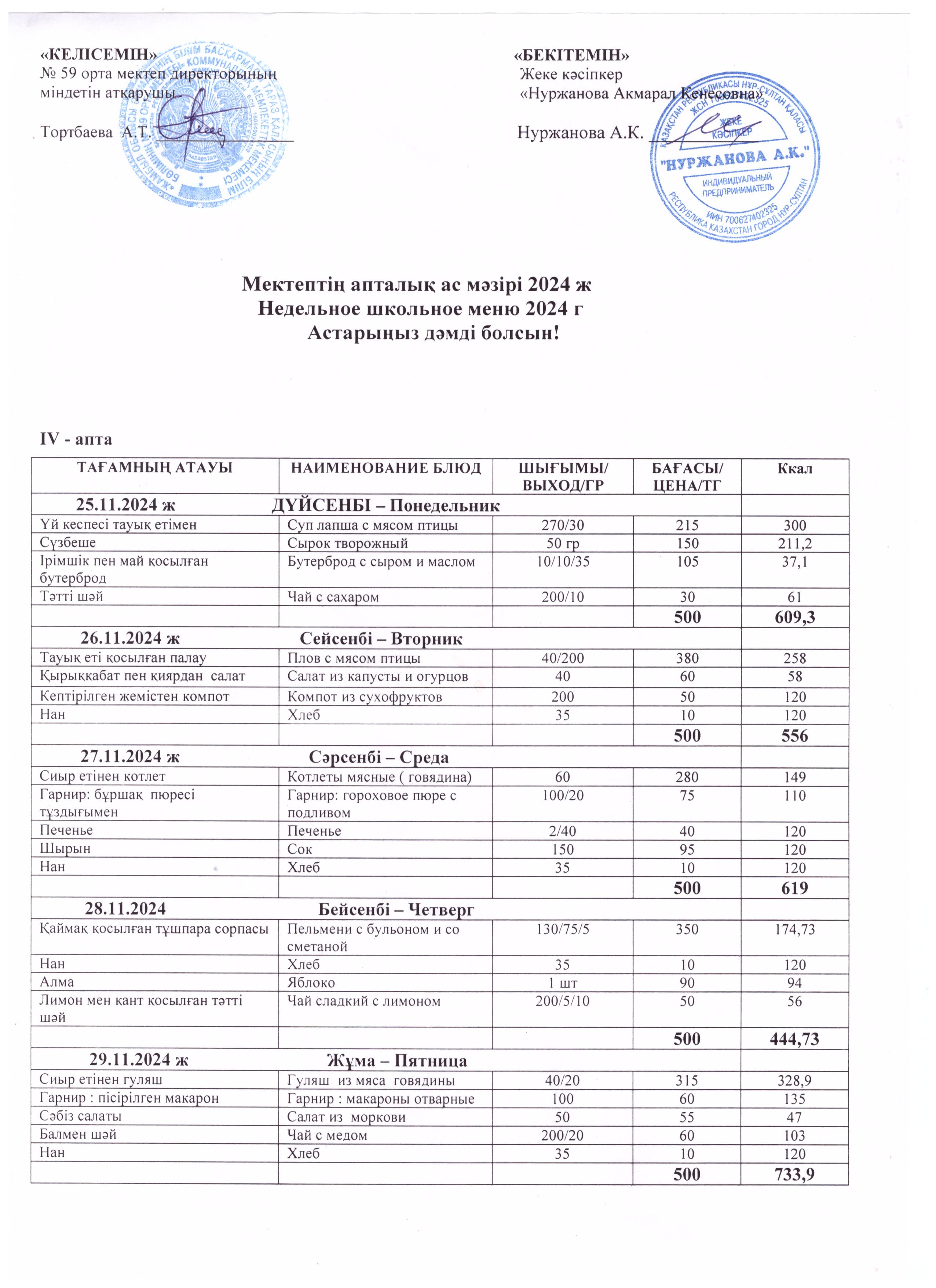 25.11.2024-29.11.2024 жыл! Апталықас мәзірі. » №59 орта мектеп