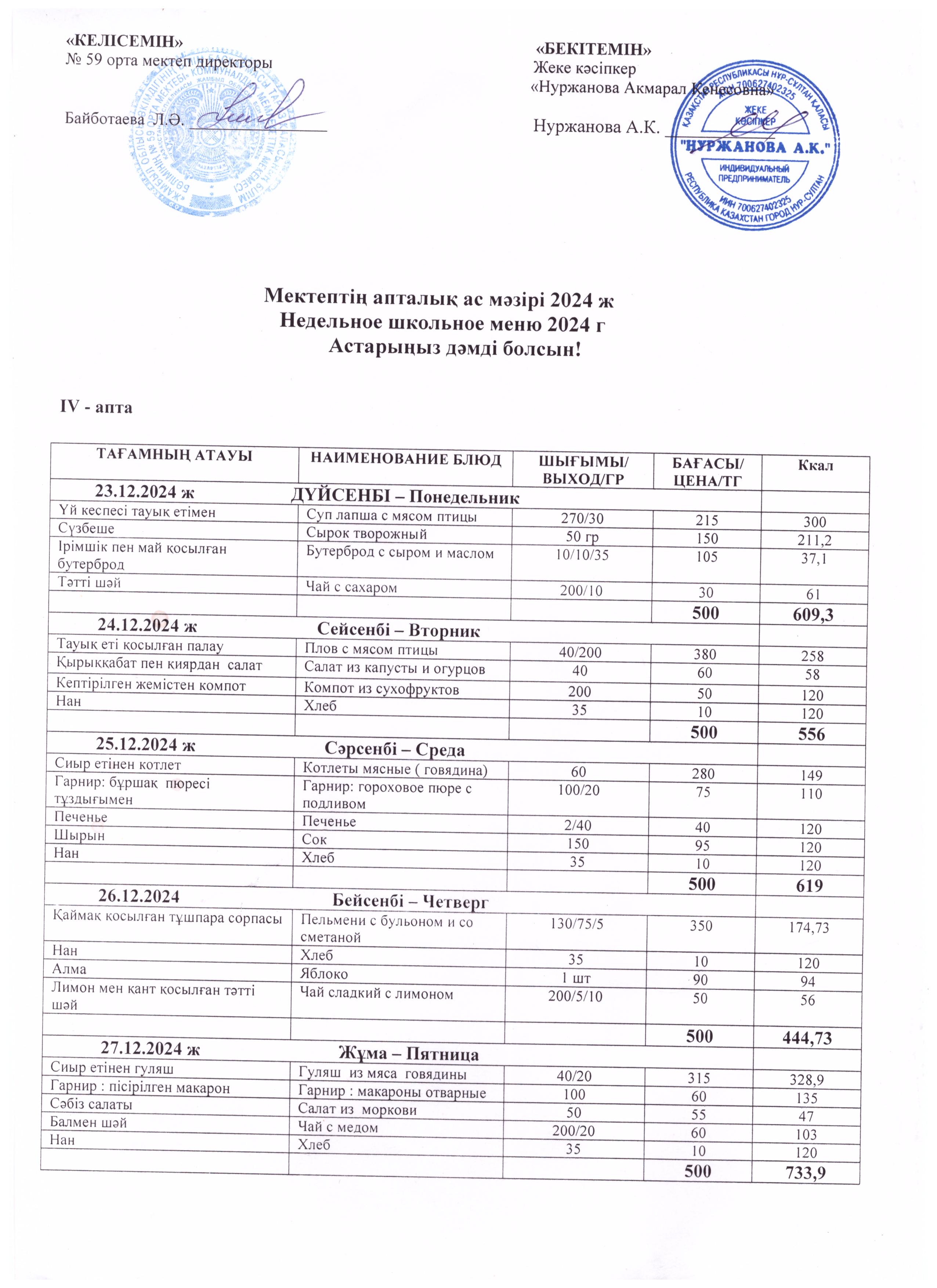 23.12.2024-27.12.2024 жыл! Апталық ас мәзірі. » №59 орта мектеп