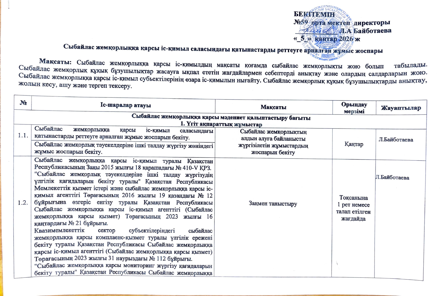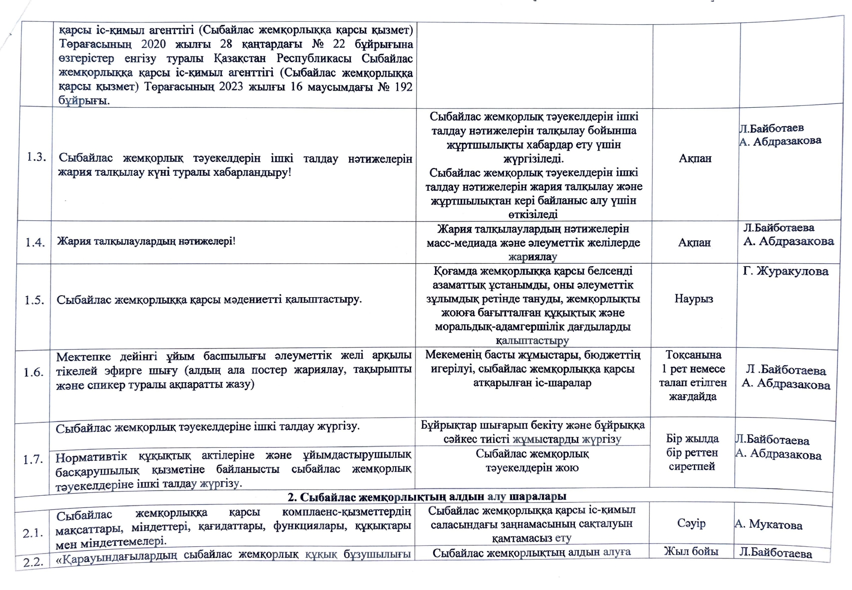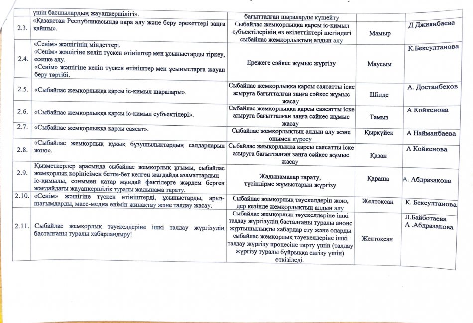 04 наурыз 2026 0 1 2 3 4 5 Сыбайлас жемқорлыққа қарсы іс-қимыл саласындағы қатынастарды реттеуге арналған жұмыс жоспары Сыбайлас жемқорлыққа қарсы іс-қимыл саласында,ы қатынастарды реттеуге арналған жұмыс жоспары